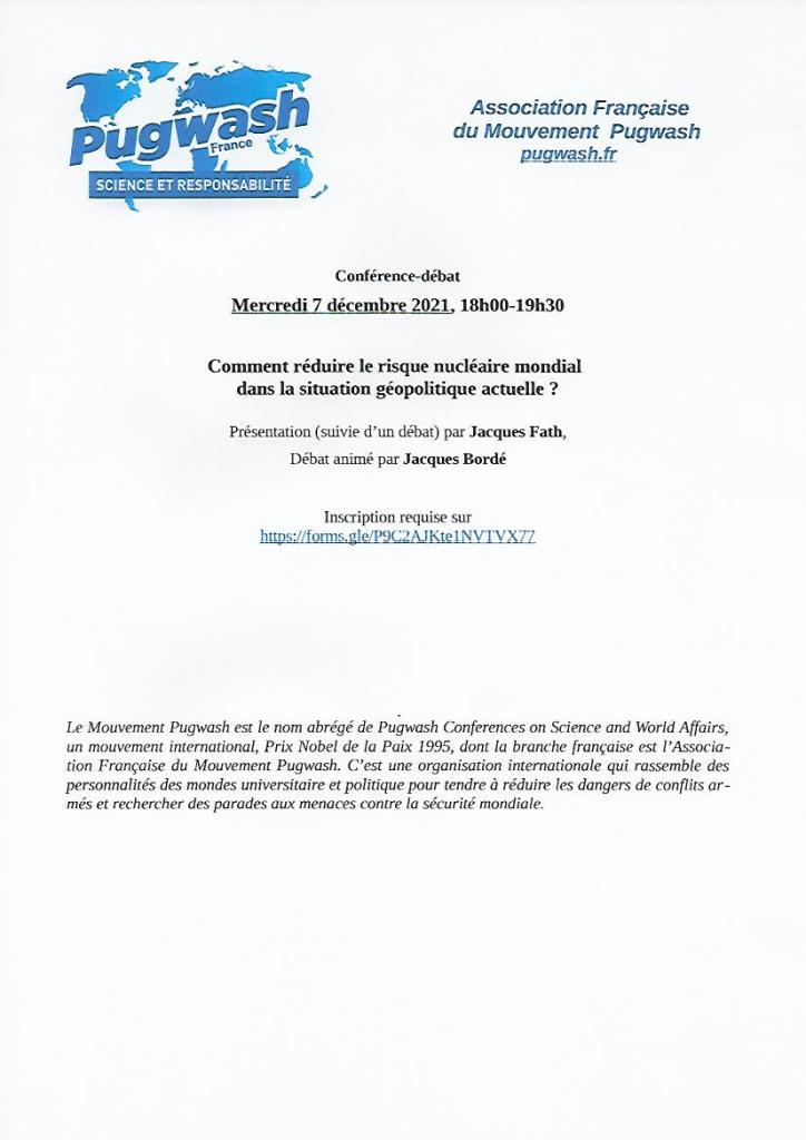 Bonjour, Je suis désolé de n’avoir pas répondu plus tôt à votre message. Avec la sortie de mon livre j’ai eu beaucoup d’occupations. Pour répondre à votre question concernant Pugwash, je dirai que je suis un peu étonné de votre appréciation. Je crois l’engagement de cette organisation sincère. Je ne sais peut-être pas tout, mais ma relation de travail avec eux en France (un débat public fort intéressant) a été sans ombre et sans problème. Je vous donne mon mail personnel. C’est plus pratique pour échanger… fath.jacques@wanadoo.fr Avec mes cordiales salutations, Jacques Fath