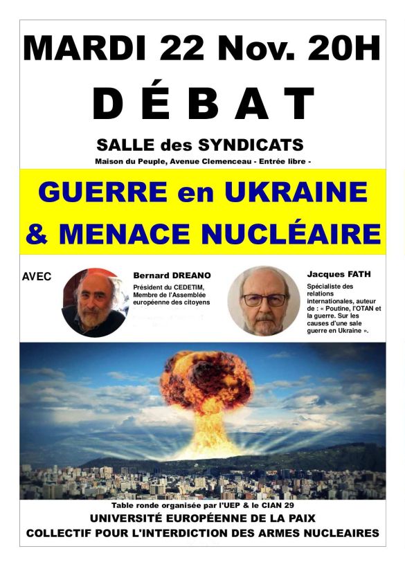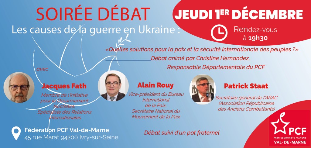 Le 22 novembre à Brest à l’invitation de l’Université Européenne de la Paix, le 1er décembre à l’invitation de la Fédération du PCF du Val de Marne, et le 7 décembre à l’invitation de Pugwash-France principalement sur les questions du nucléaire militaire, à l’École Normale Supérieure. Des échanges sur le fond quant aux analyses nécessaires et aux enjeux politiques dans une actualité brulante et préoccupante.